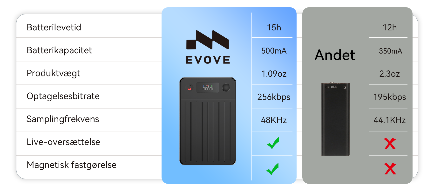Näin syntyi Evove AI -älytallennin. Siinä on tehokas AI-moottori reaaliaikaiseen litterointiin sekä älykäs melunvaimennusteknologia, joka takaa puhtaan äänenlaadun. Tämä on Evoven ydinlupaus: vapauttaa mielesi ja antaa sinun keskittyä siihen, mikä on todella tärkeää.